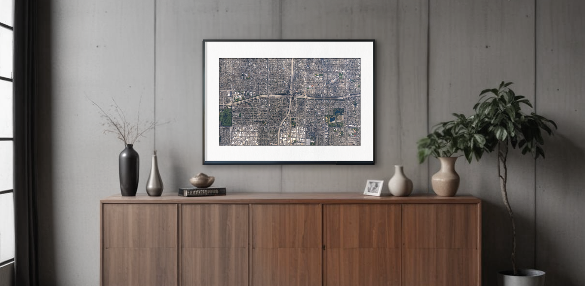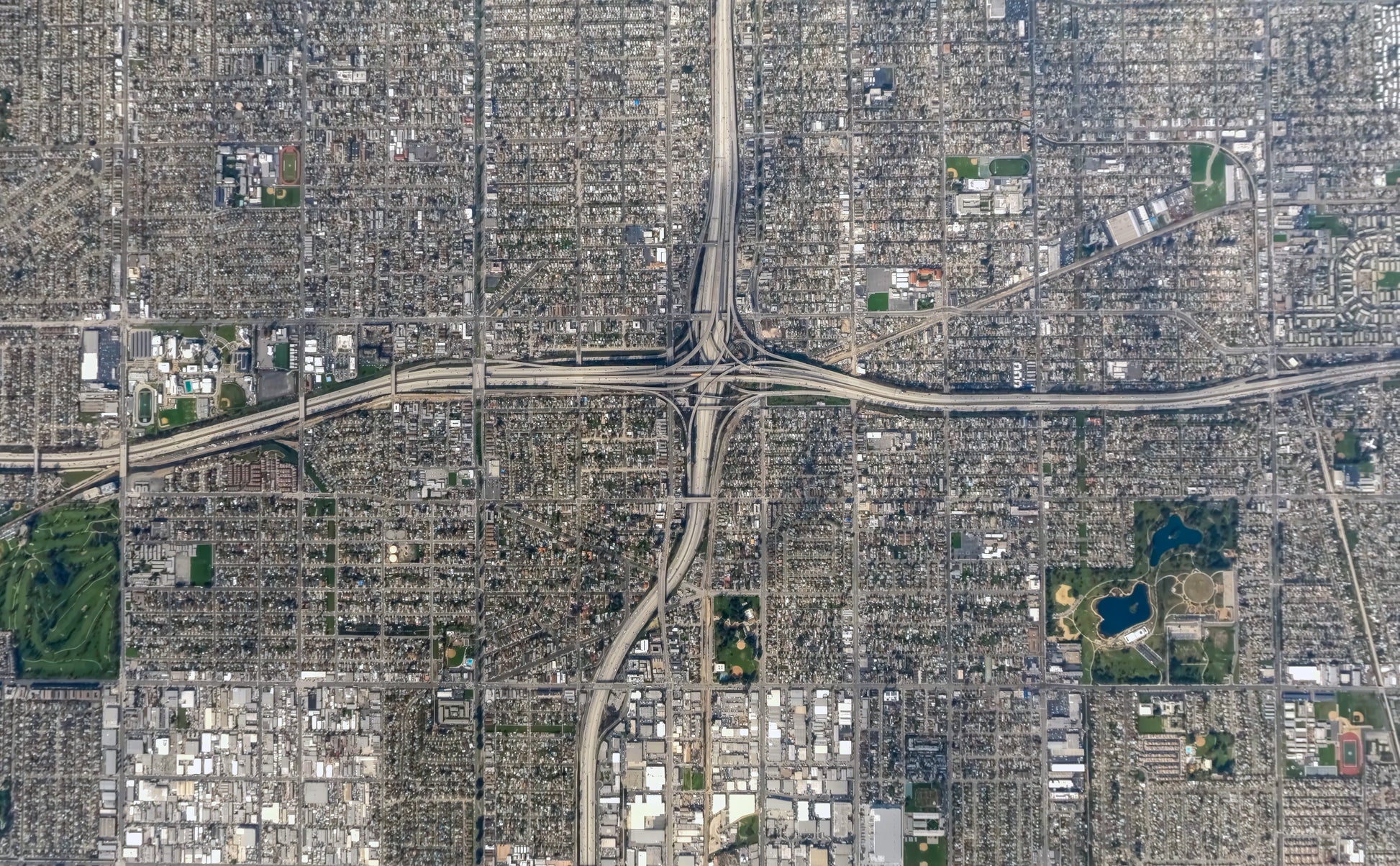 Una vista panorámica del cruce de la I-110 y la I-105 rompe la monótona expansión urbana. Capturado desde un avión monomotor que volaba a 11.500 pies.
