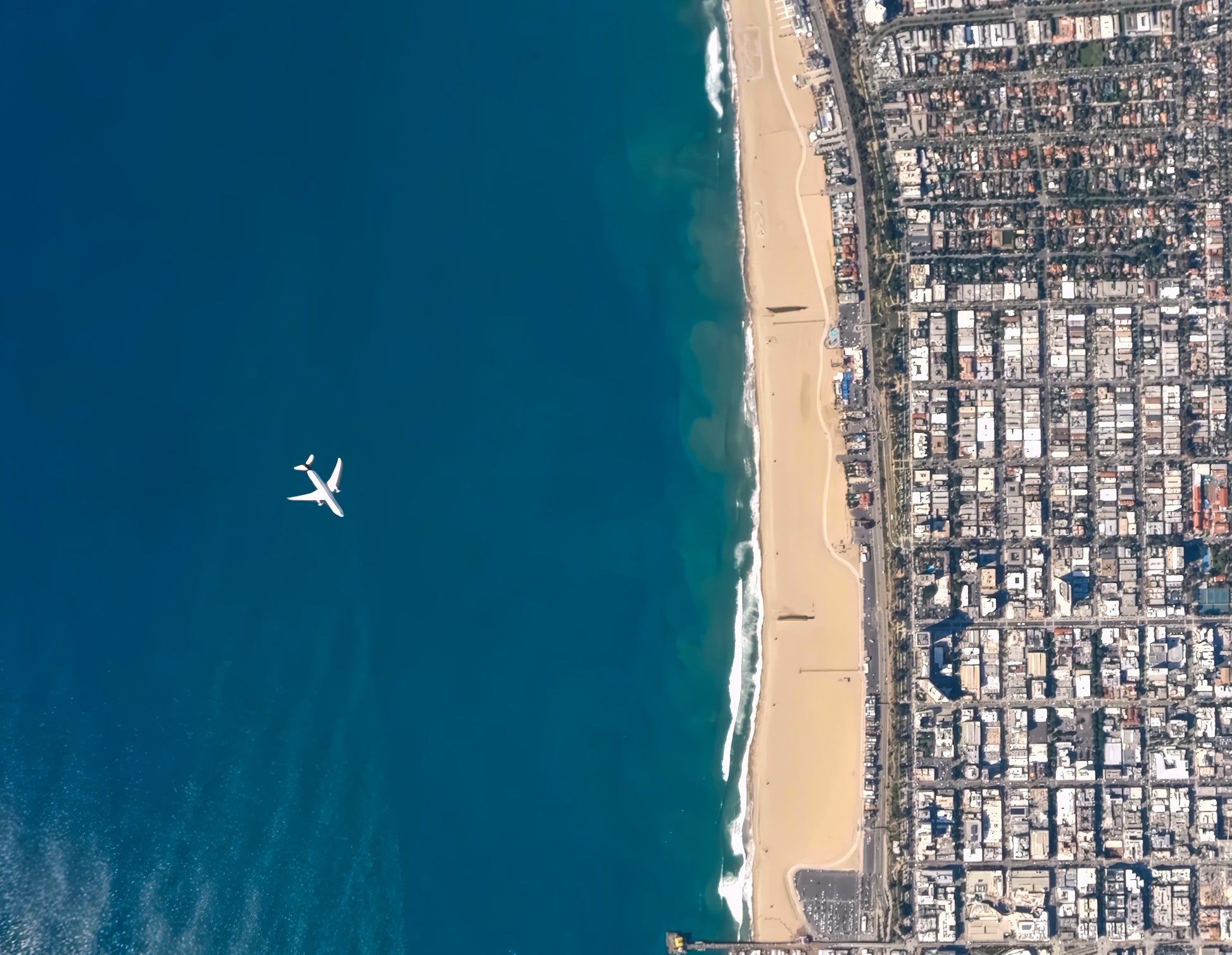 Regardant droit vers les plages immaculées de Santa Monica, en Californie, un jet se dirige vers l'aéroport de LAX. Filmé depuis un avion monomoteur à 11 500 pieds.